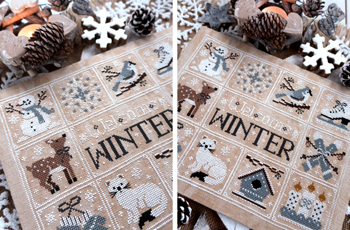 In questo schema troverete tutto ciò che rende magica questa candida stagione: il fiocco di neve, il pupazzo di neve, poi gli animaletti invernali, il cerbiatto, la cincia bicolore (Baeolophus bicolor) con la sua casetta, e l’ermellino, e poi tutto l’occorrente per divertirsi sulla neve e sul ghiaccio, ovvero i guantini, gli sci con le racchette e i pattini da ghiaccio. E poi non potevano mancare le candele che rendono magiche le serate invernali e solstiziali.