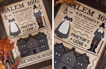 Lo schema comprende entrambe le versioni, con filato tinto a mano da The Gentle Art su lino bianco antico, e con semplice filato bianco su lino tinto a mano, grigio. La seconda versione è abbellita con tre piccole perle.